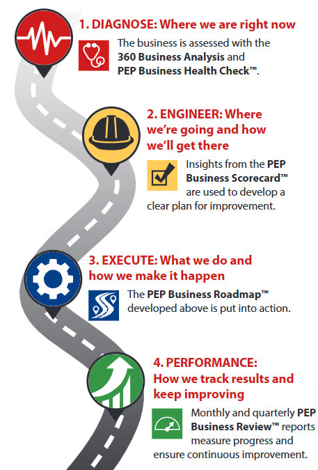 The PEP Business System™ (Productive, Efficient, and Profitable) is a structured operating system that keeps the business leaders disciplined, teams aligned, and strategies executed – month after month, year after year. Once installed, it provides a clear framework for running a more Productive, Efficient, and Profitable business. Installation utilizes our DEEP process (Diagnose, Engineer, Execute, Performance), ensuring the PEP Business System™ takes root and delivers lasting results.
